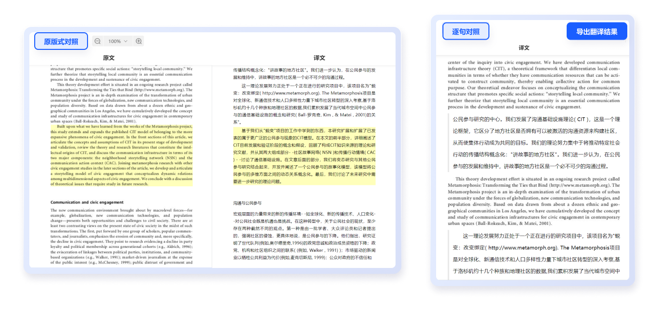 原版式对照、逐句对照,可根据个人习惯自由选择自由导出翻译结果